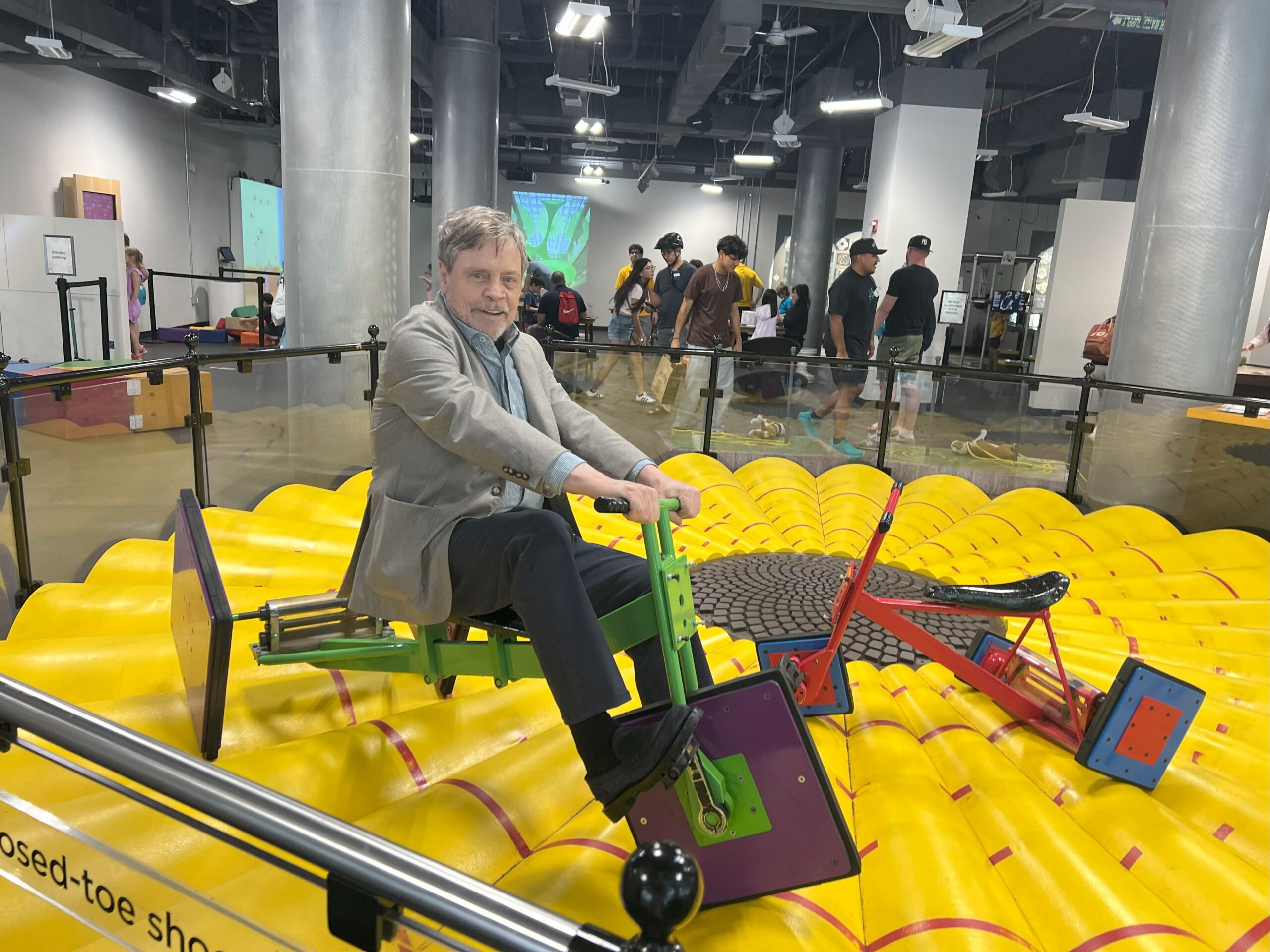 Mark Hamill riding the square-wheeled tricycle at MoMath (photo from MoMath.org)